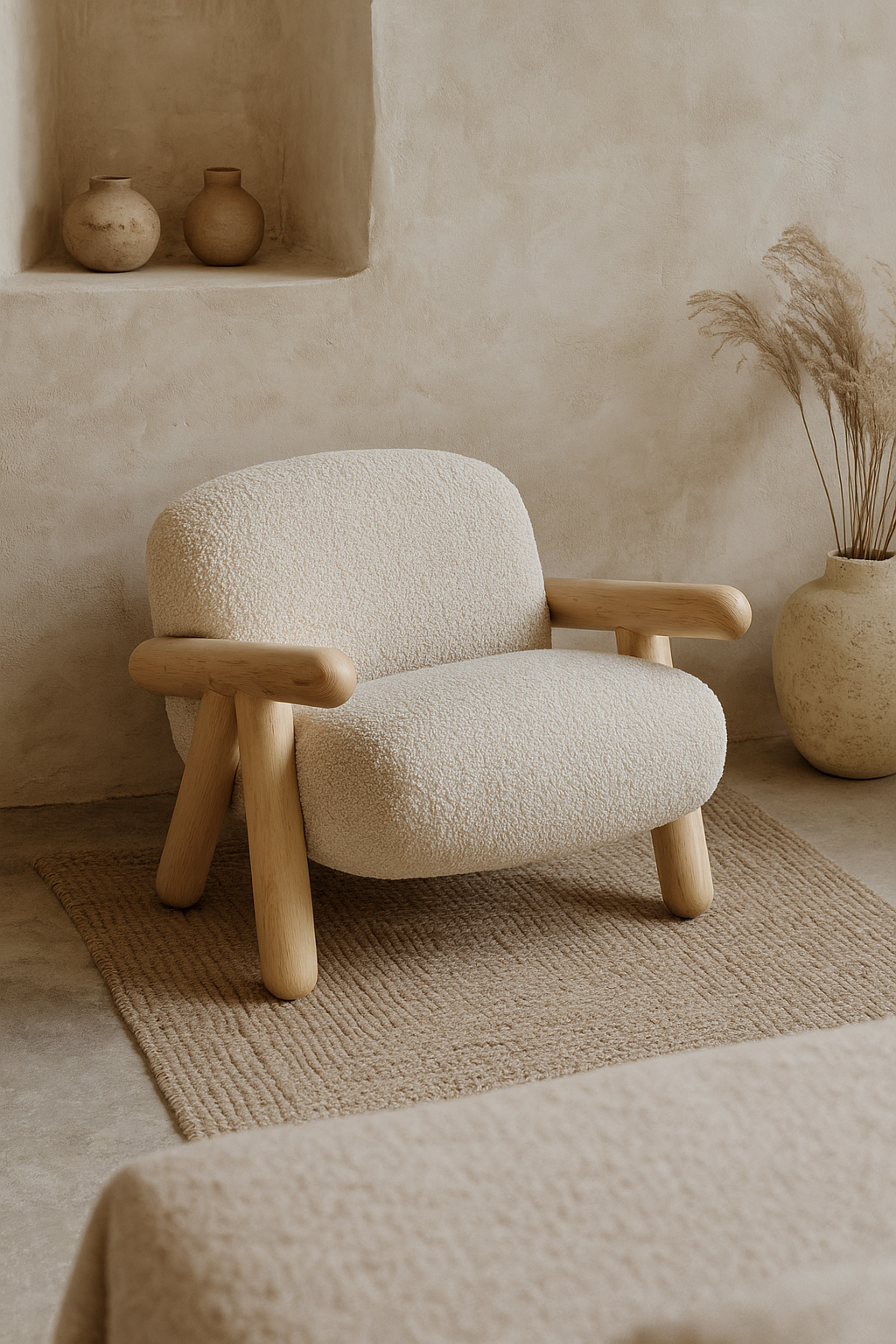 Глубокое, мягкое и визуально расслабляющее. Идеально для зон отдыха или спальни в стиле ваби-саби. Ткань с длинным ворсом, корпус — на массиве.
