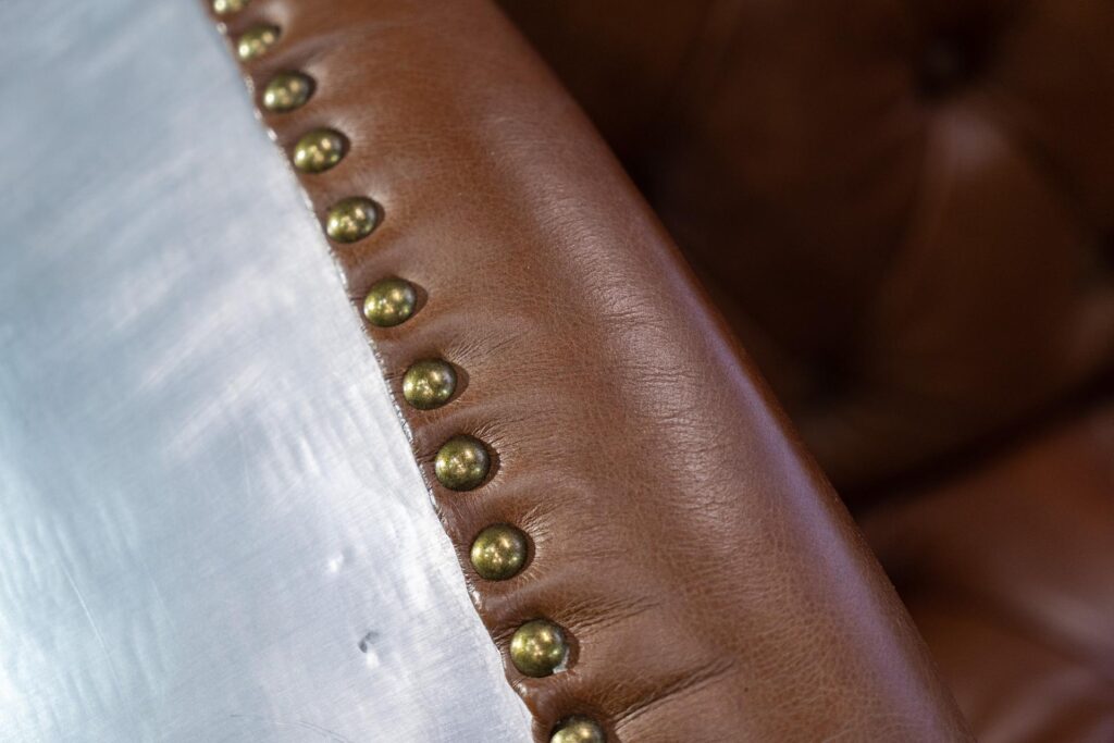 — Изысканная отделка: Диван выполнен на прочном металлическом каркасе, украшенном изысканной алюминиевой отделкой и латунными гвоздиками, которые добавляют нотки индустриального шика и стилевой оригинальности.