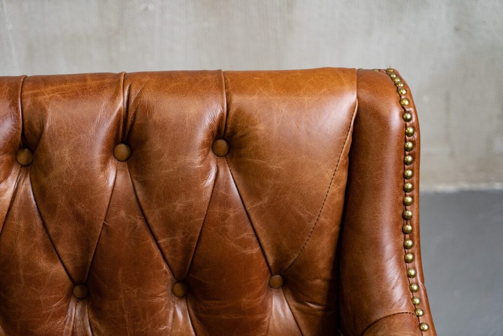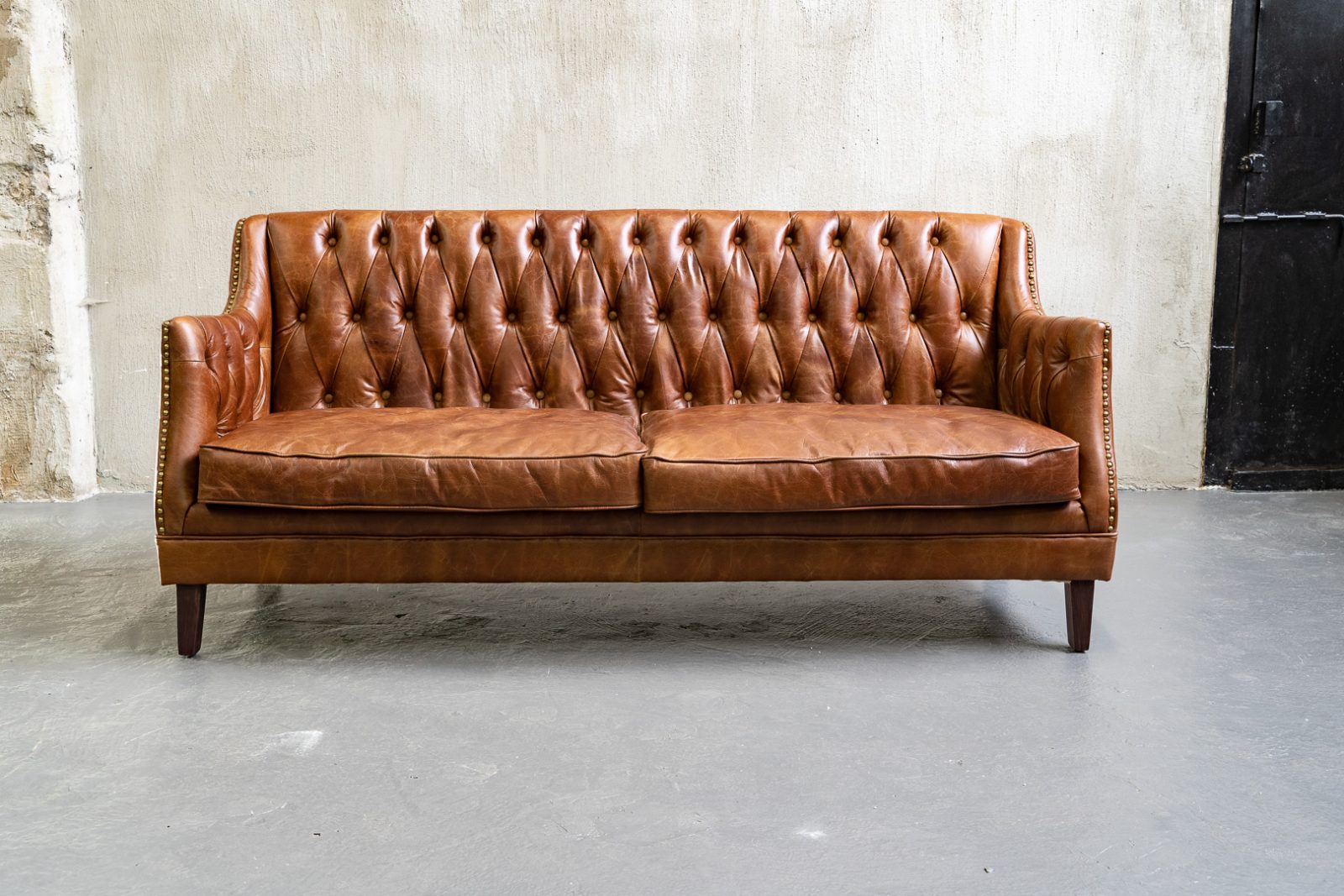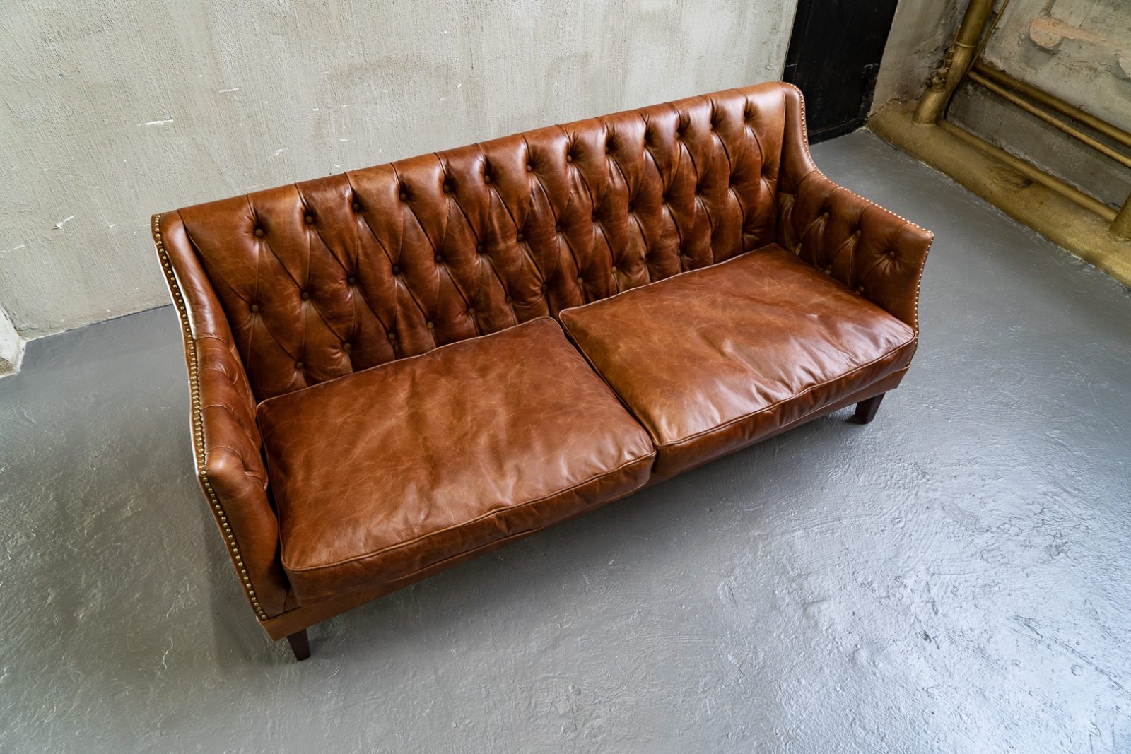 Сочетание прочного каркаса из лиственницы и массивных деревянных ножек обеспечивает надежность и долговечность, а обивка из высококачественной коровьей кожи Top Grain дарит ощущение роскоши и уюта. Искусно отделанный латунными гвоздиками, этот диван не только комфортен, но и привлекает внимание своим изысканным дизайном.