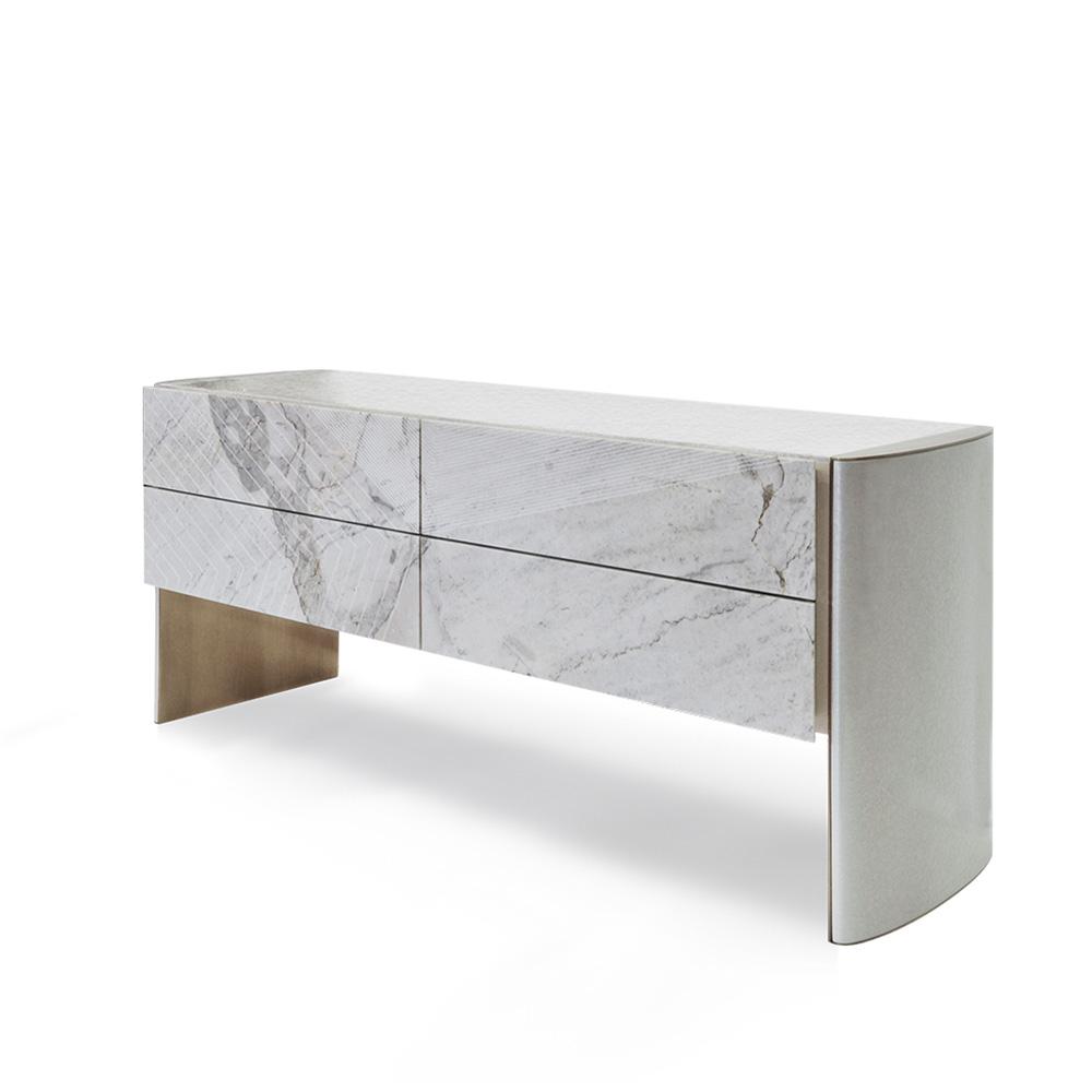 Финишные детали, выполненные из нержавеющей стали и бронзы, придают комоду изысканности и подчеркивают его статусный вид. Доступный в нескольких вариантах исполнения, этот комод легко впишется в любой современный интерьер — от минимализма до классики.