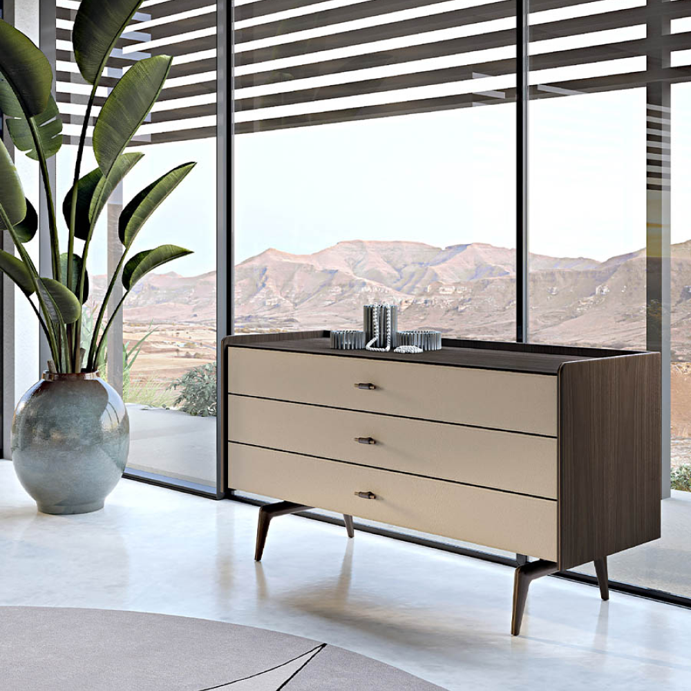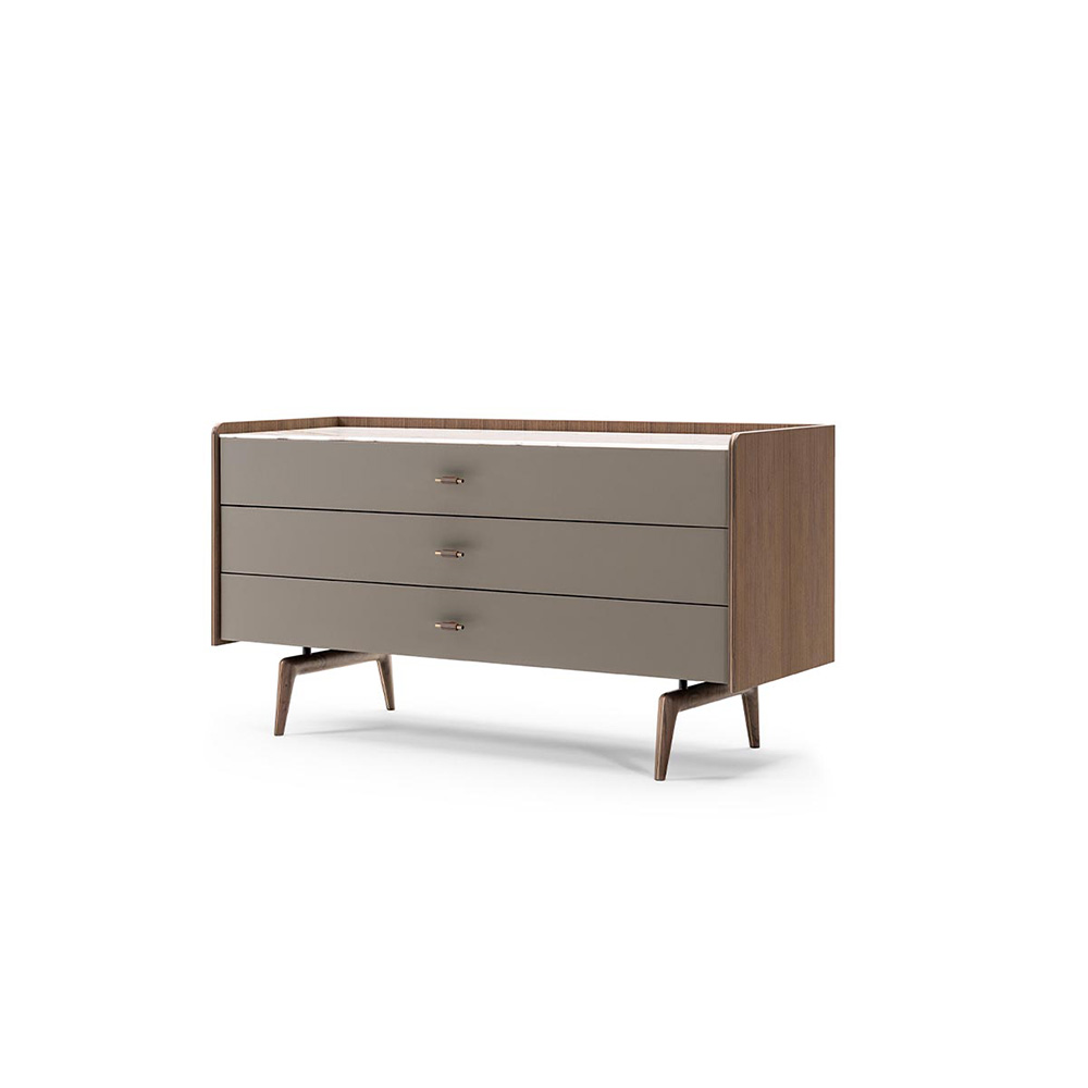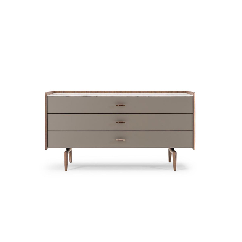 — Металлические ножки: Ножки из нержавеющей стали с бронзовой полировкой придают модели нотку современности и уверенности в прочности конструкции. Они не только визуально поднимают комод, но и обеспечивают отличную устойчивость и поддержку.