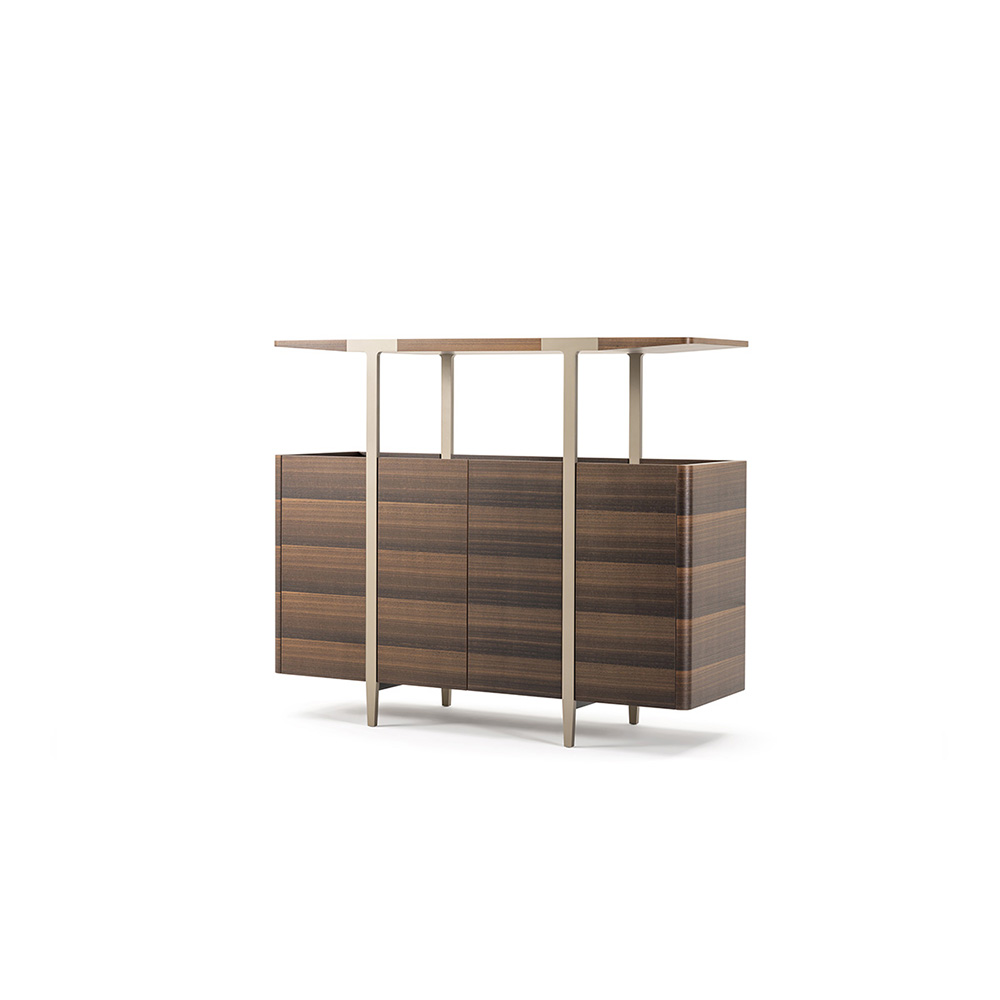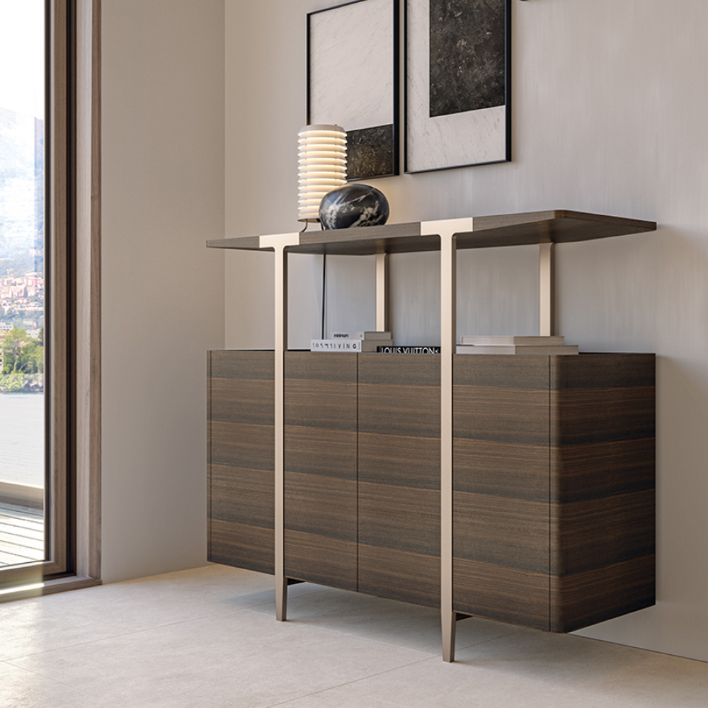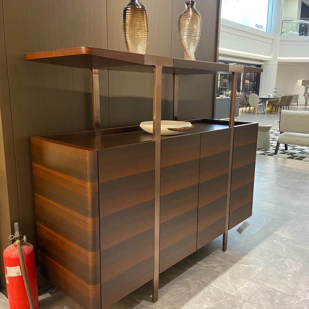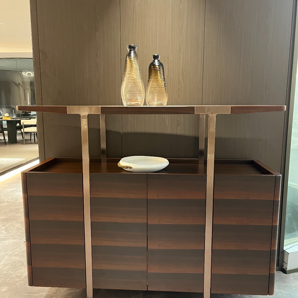 Комод оснащен прочной полкой и закаленным стеклом, обеспечивая надежное место для хранения ваших любимых вещей, книг или декора. Элегантные ножки из нержавеющей стали с бронзовой полировкой придают изделию современный вид и гарантируют устойчивость, создавая гармоничный баланс между стилем и функциональностью.
