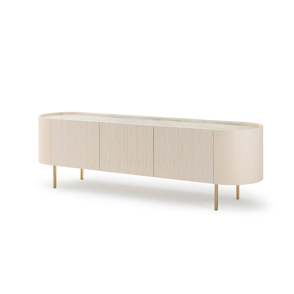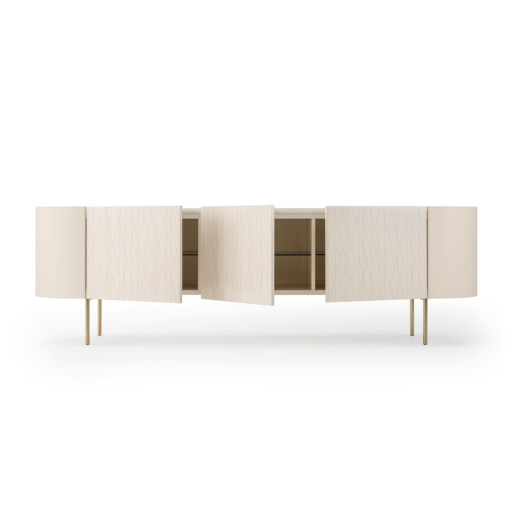 Комод стильно дополняют ножки из нержавеющей стали с бронзовой полировкой, придающие изделию современный вид и дополнительную устойчивость. Закаленное стекло придает комоду изысканность и защищает содержимое от пыли, сохраняя его всегда в идеальном состоянии.