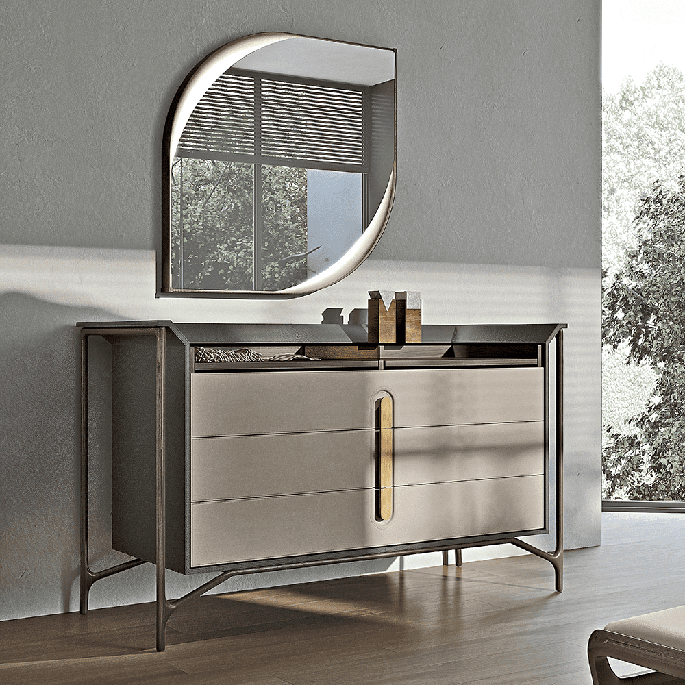 Его изысканный каркас из массива ореха придаёт комоду благородный вид, подчеркивая вашу индивидуальность и вкус. А выдвижные полки обеспечивают оптимальное использование пространства, позволяя удобно организовать хранение вещей — от одежды до любимых книг и аксессуаров.