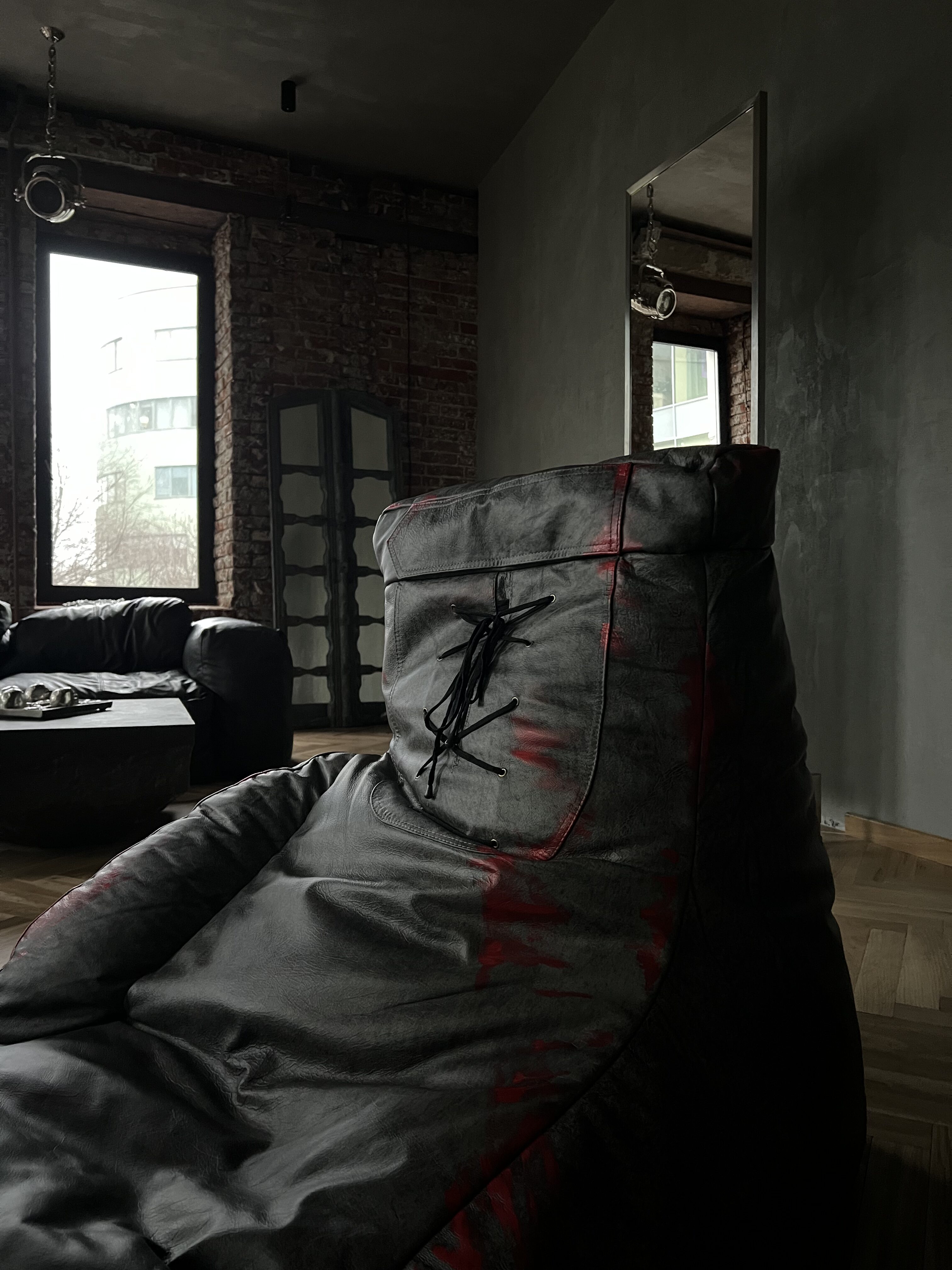 Фактурная обивка с эффектом состаренного материала подчёркивает эстетику грубой индустрии, а контрастные швы добавляют визуальной силы и акцента.