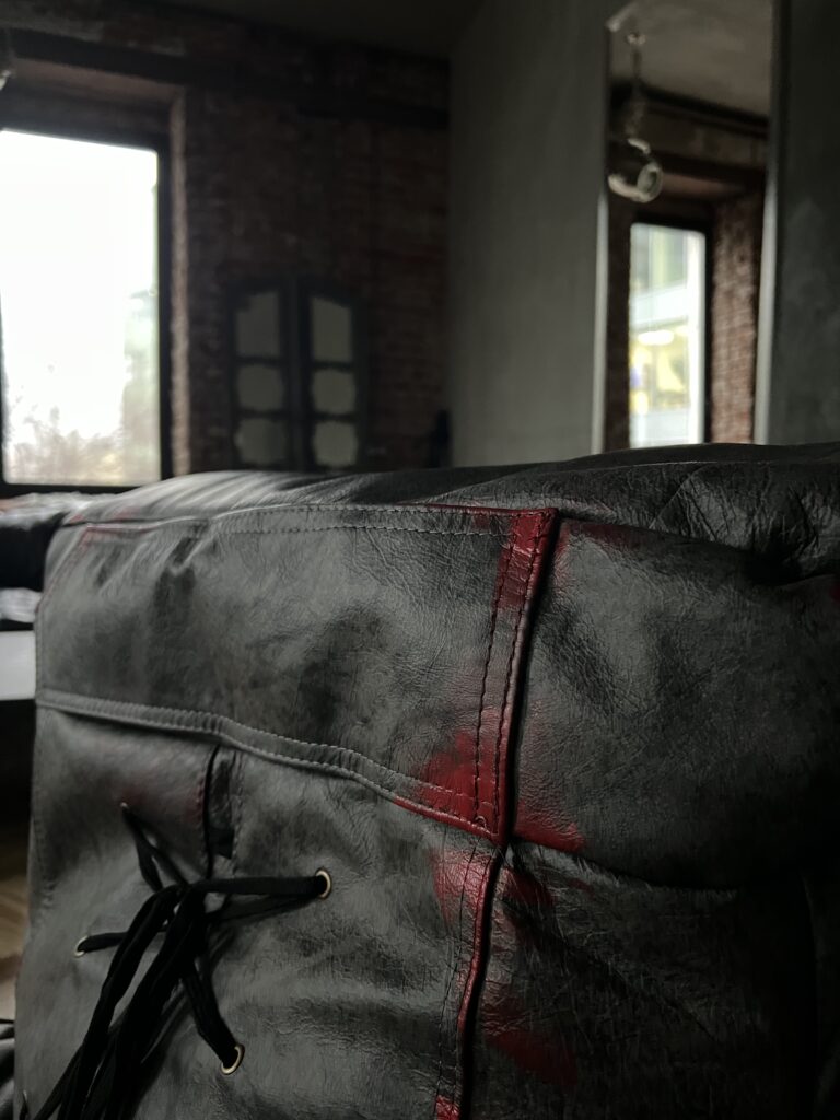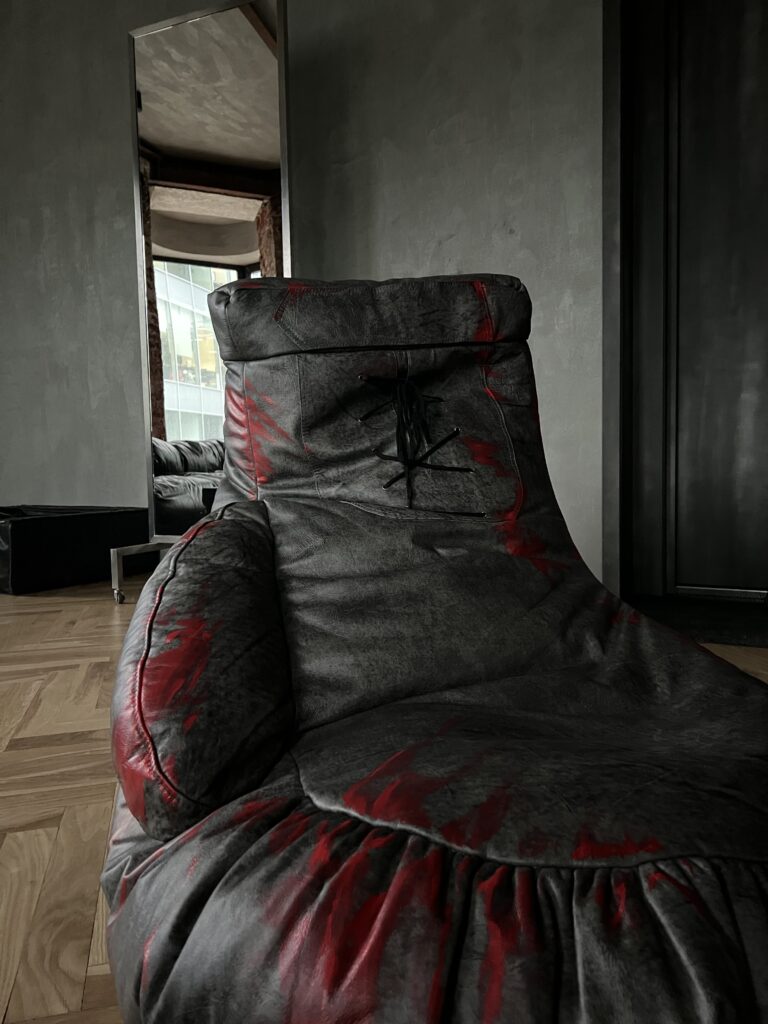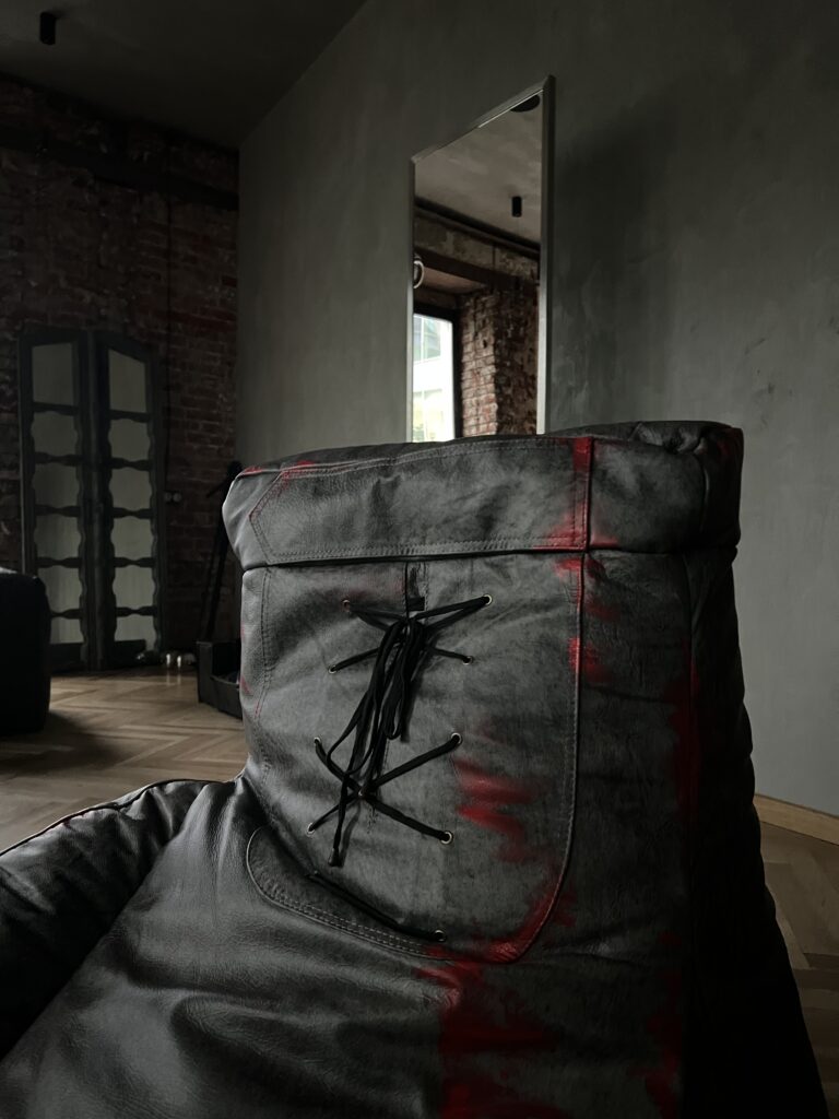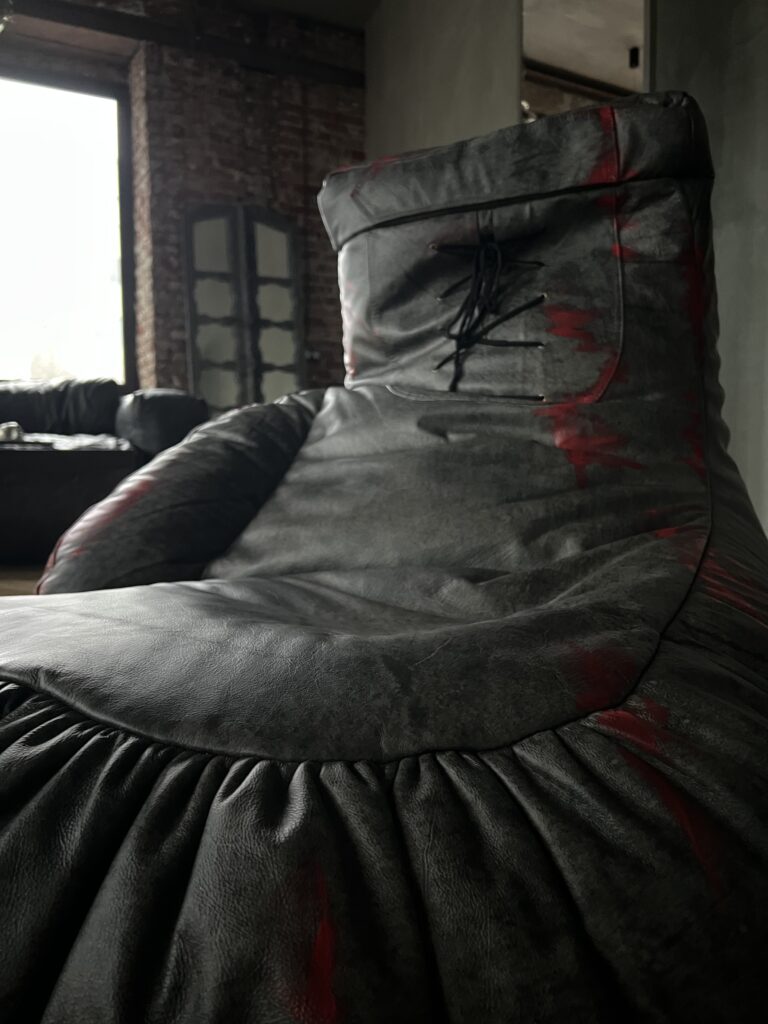 Фактурная обивка с эффектом состаренного материала подчёркивает эстетику грубой индустрии, а контрастные швы добавляют визуальной силы и акцента.
