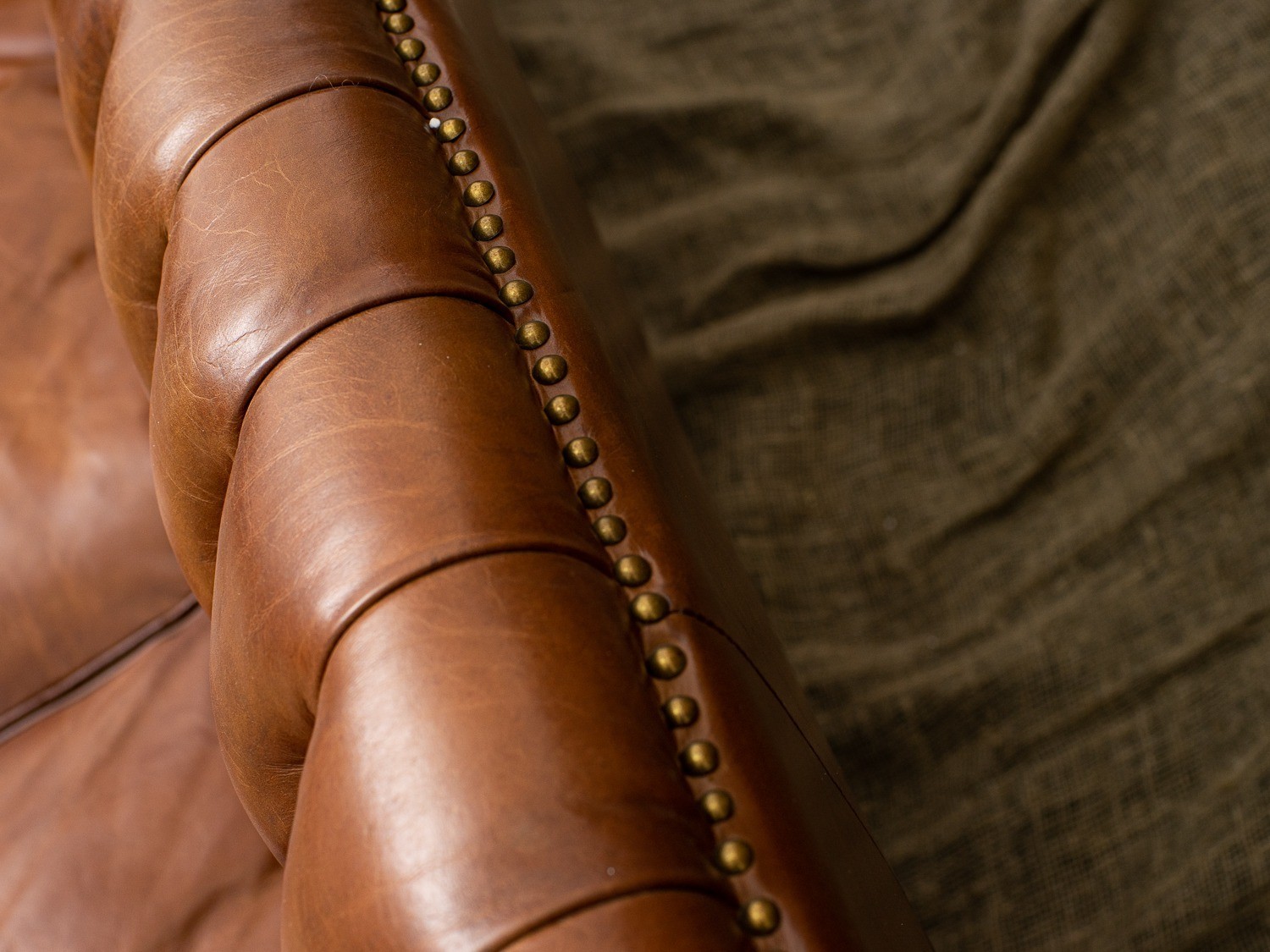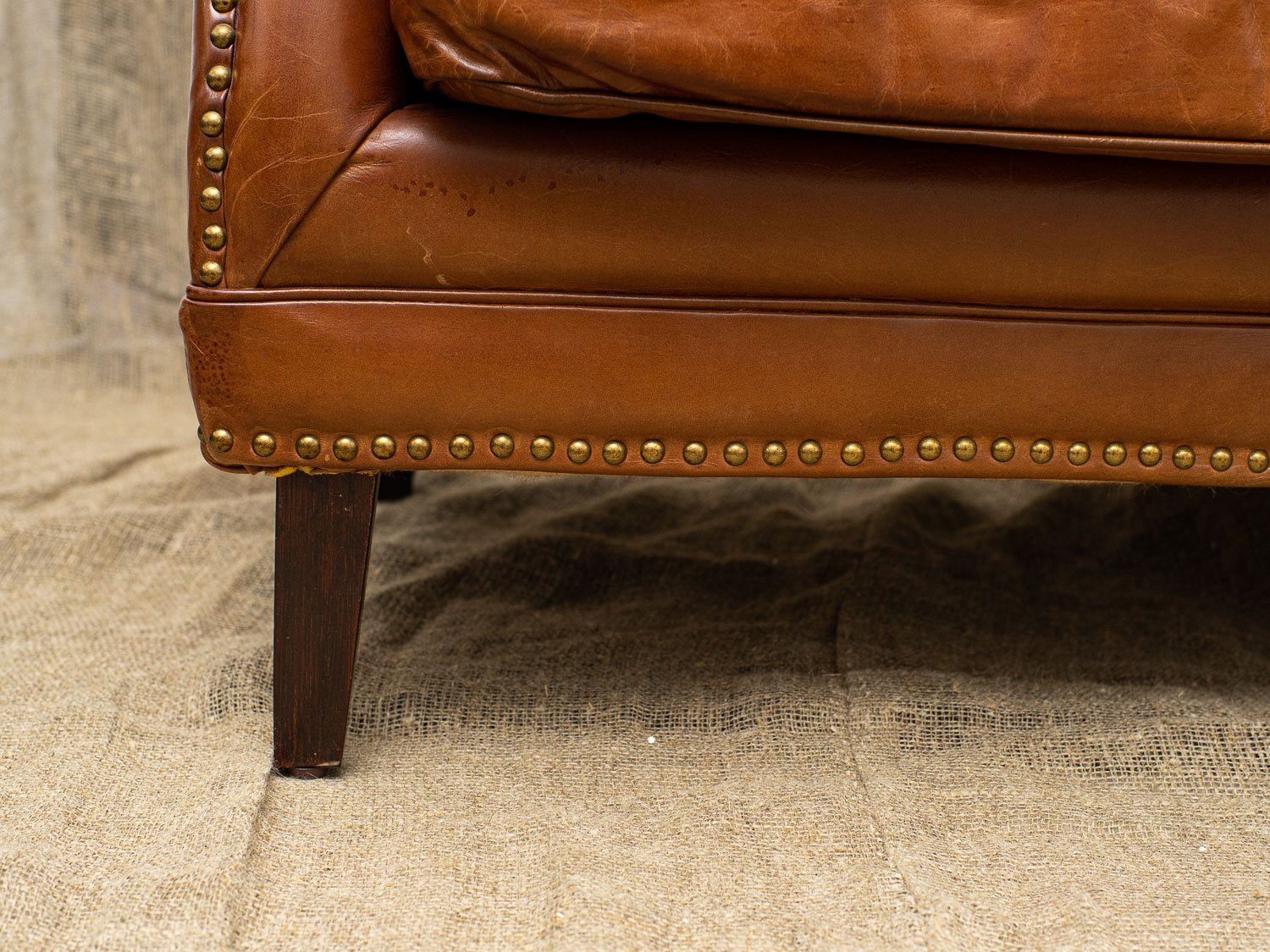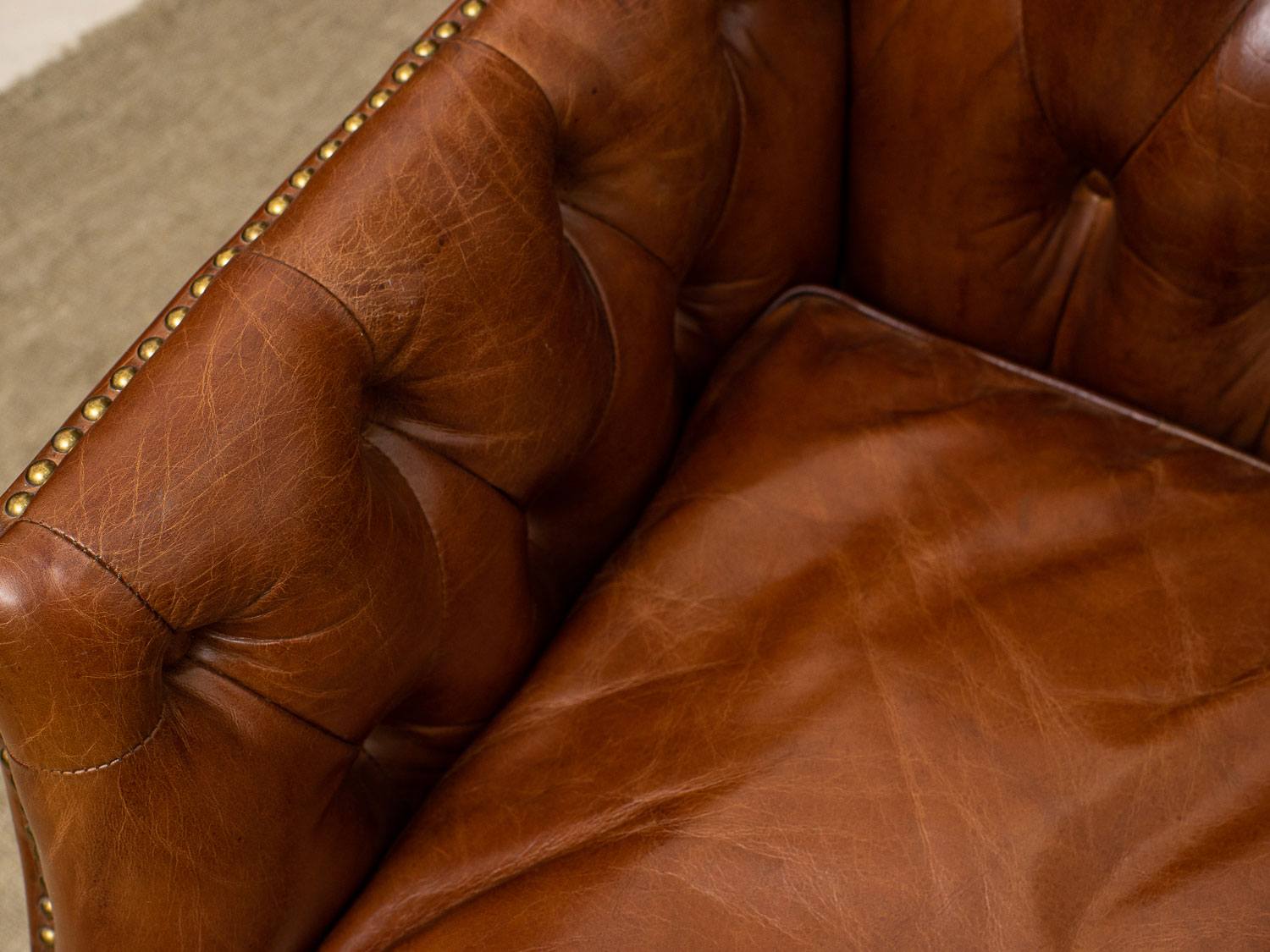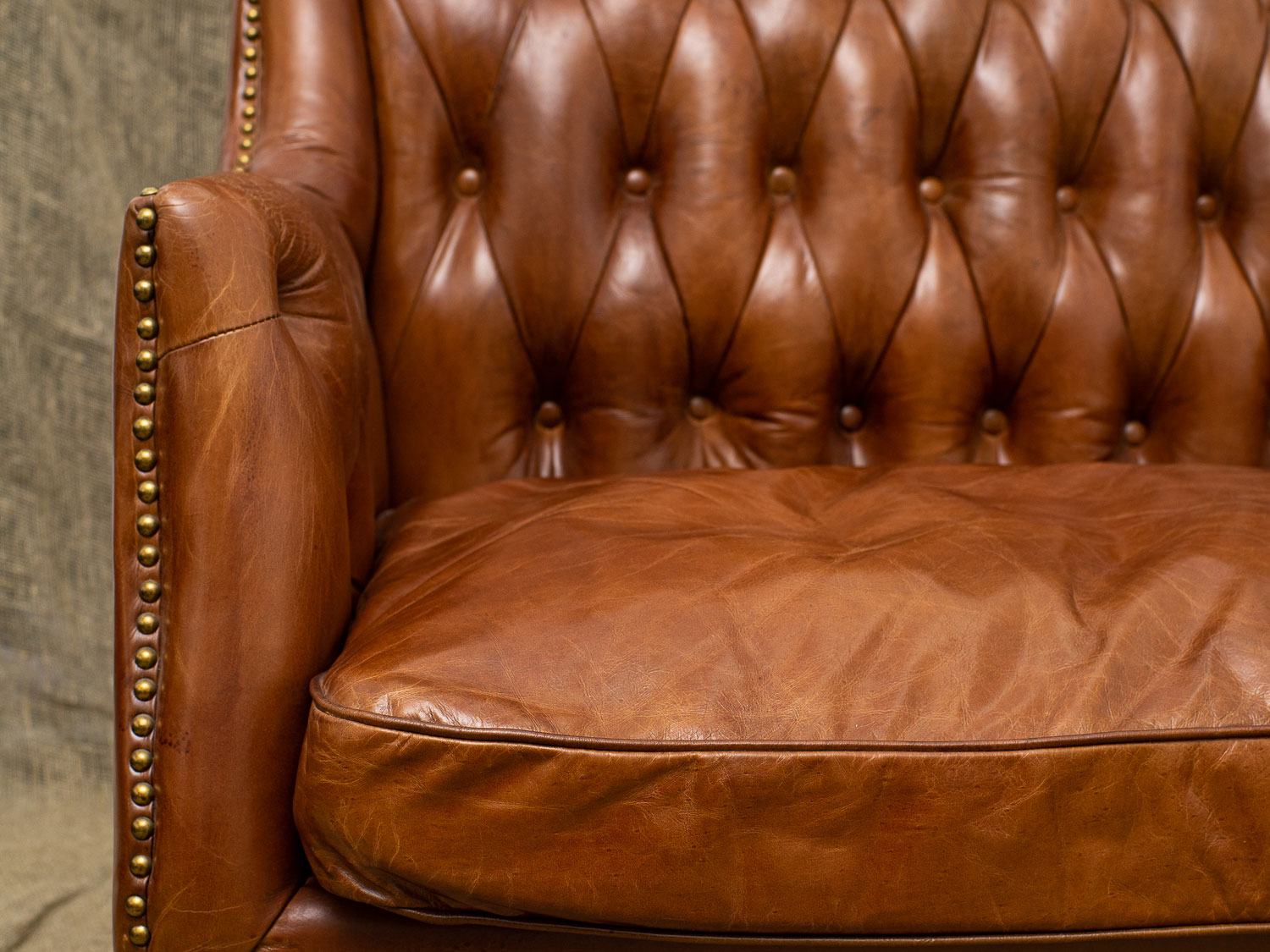 Каркас кресла изготовлен из лиственницы, что обеспечивает прочность и долговечность, а массивные деревянные ножки не только надежны, но и придают изделию стильный вид. Обивка из коровьей кожи top grain обещает роскошное ощущение на ощупь и легкость в уходе, а отделка латунными гвоздиками добавляет щепотку шарма и утонченности.