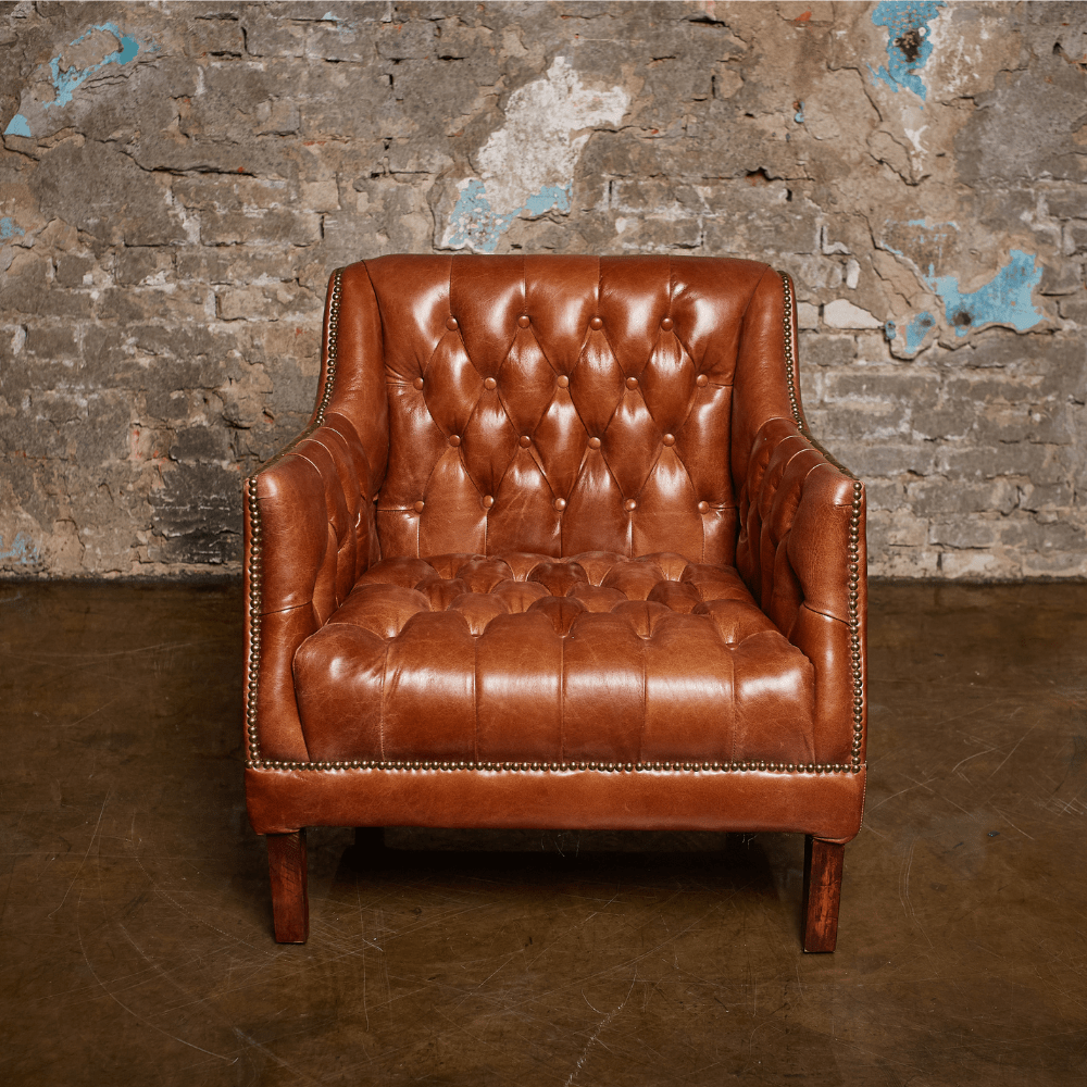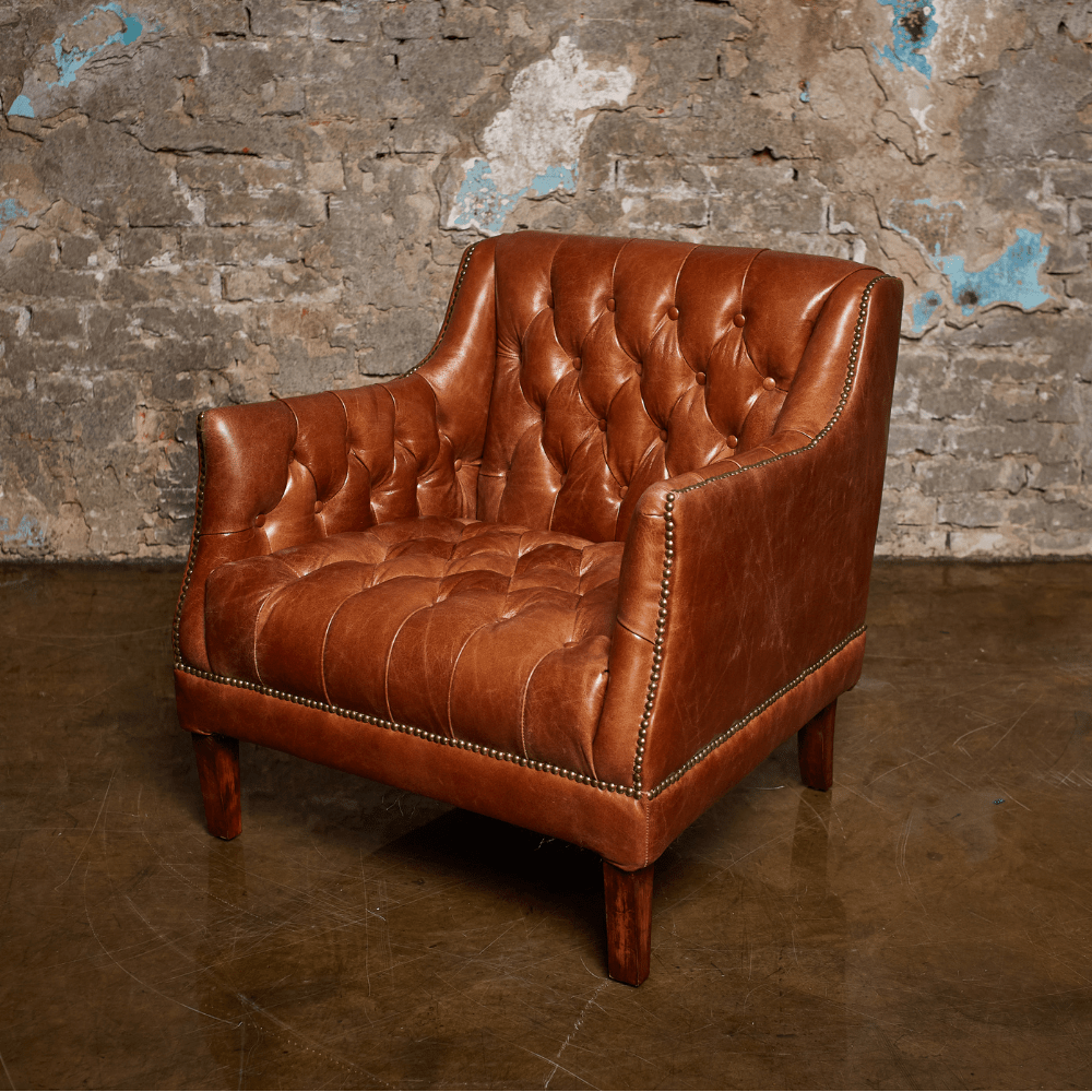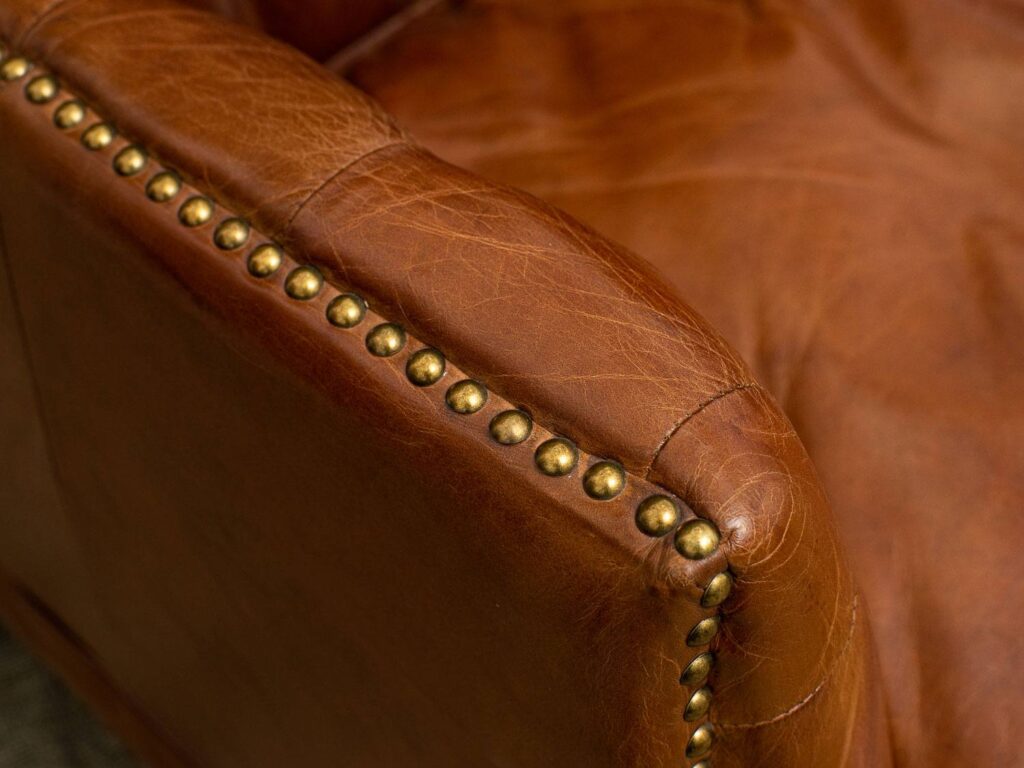 Каркас кресла изготовлен из лиственницы, что обеспечивает прочность и долговечность, а массивные деревянные ножки не только надежны, но и придают изделию стильный вид. Обивка из коровьей кожи top grain обещает роскошное ощущение на ощупь и легкость в уходе, а отделка латунными гвоздиками добавляет щепотку шарма и утонченности.