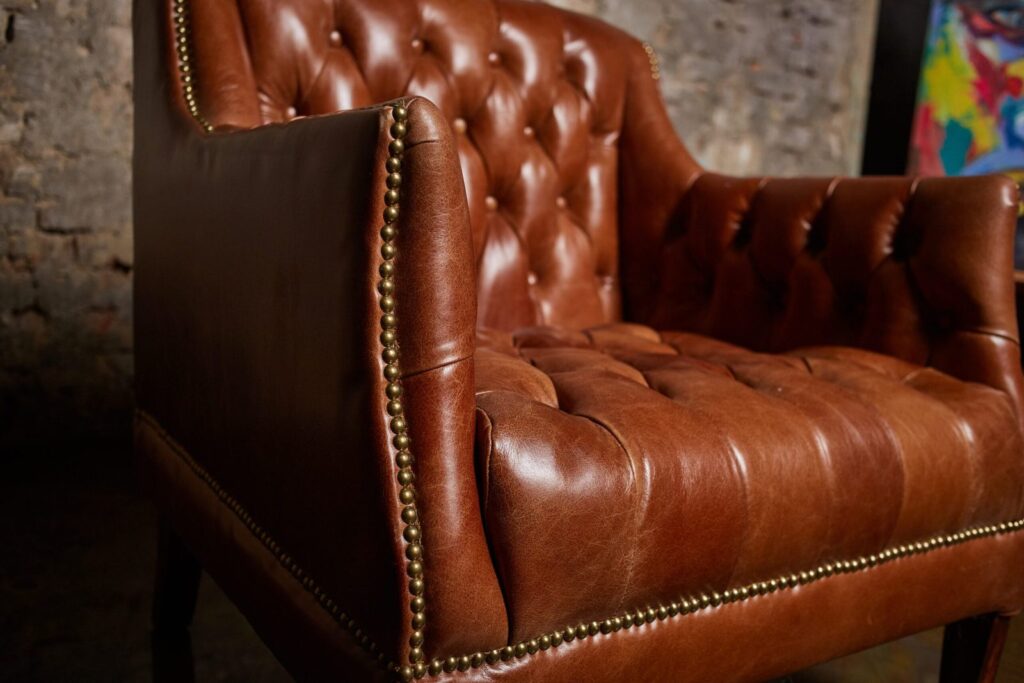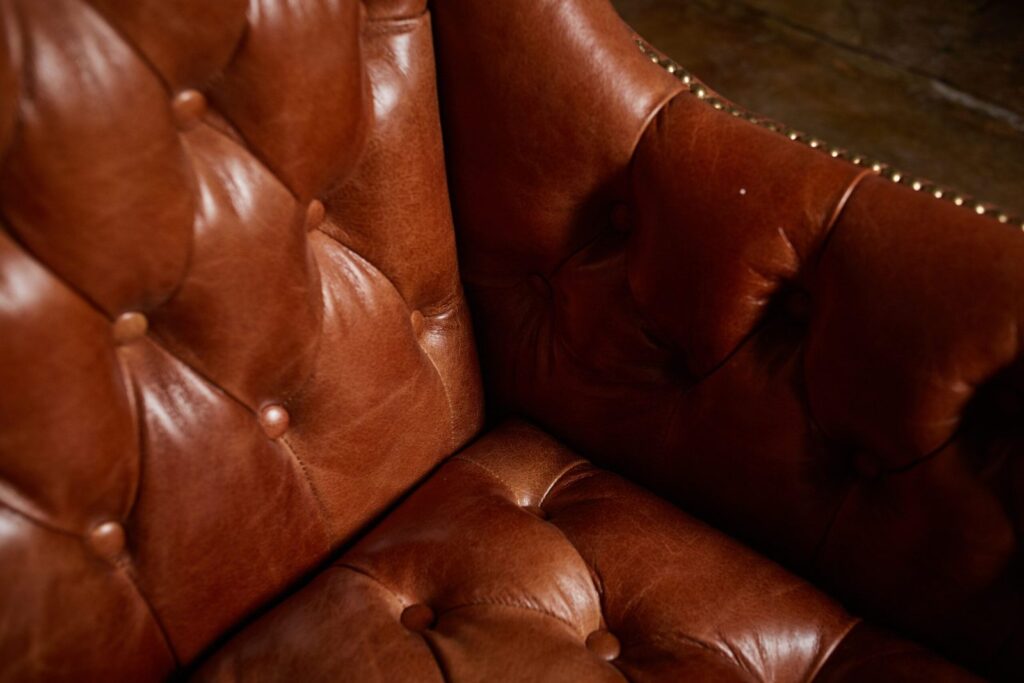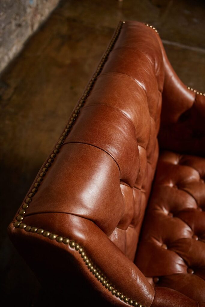 — Материалы: Диван основан на прочном каркасе из лиственницы и оснащен массивными деревянными ножками, которые обеспечивают надежность и устойчивость. Обивка из высококачественной коровьей кожи top grain не только приятна на ощупь, но и добавляет нотку роскоши в любой комнате. Финишная отделка с латунными гвоздиками придаёт изделию утонченный вид и подчеркивает его высокое качество.