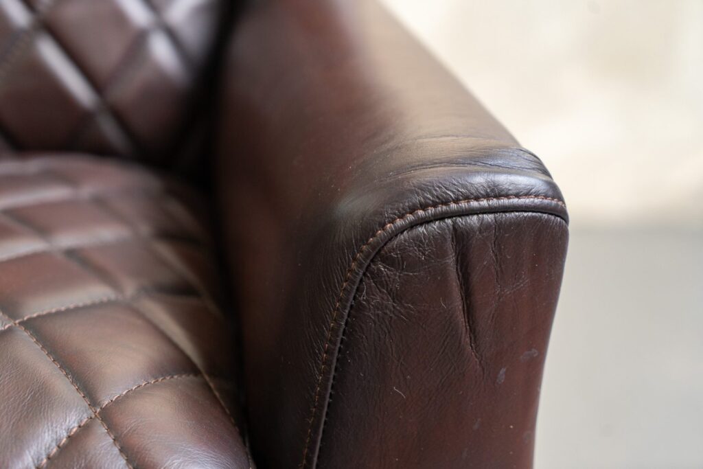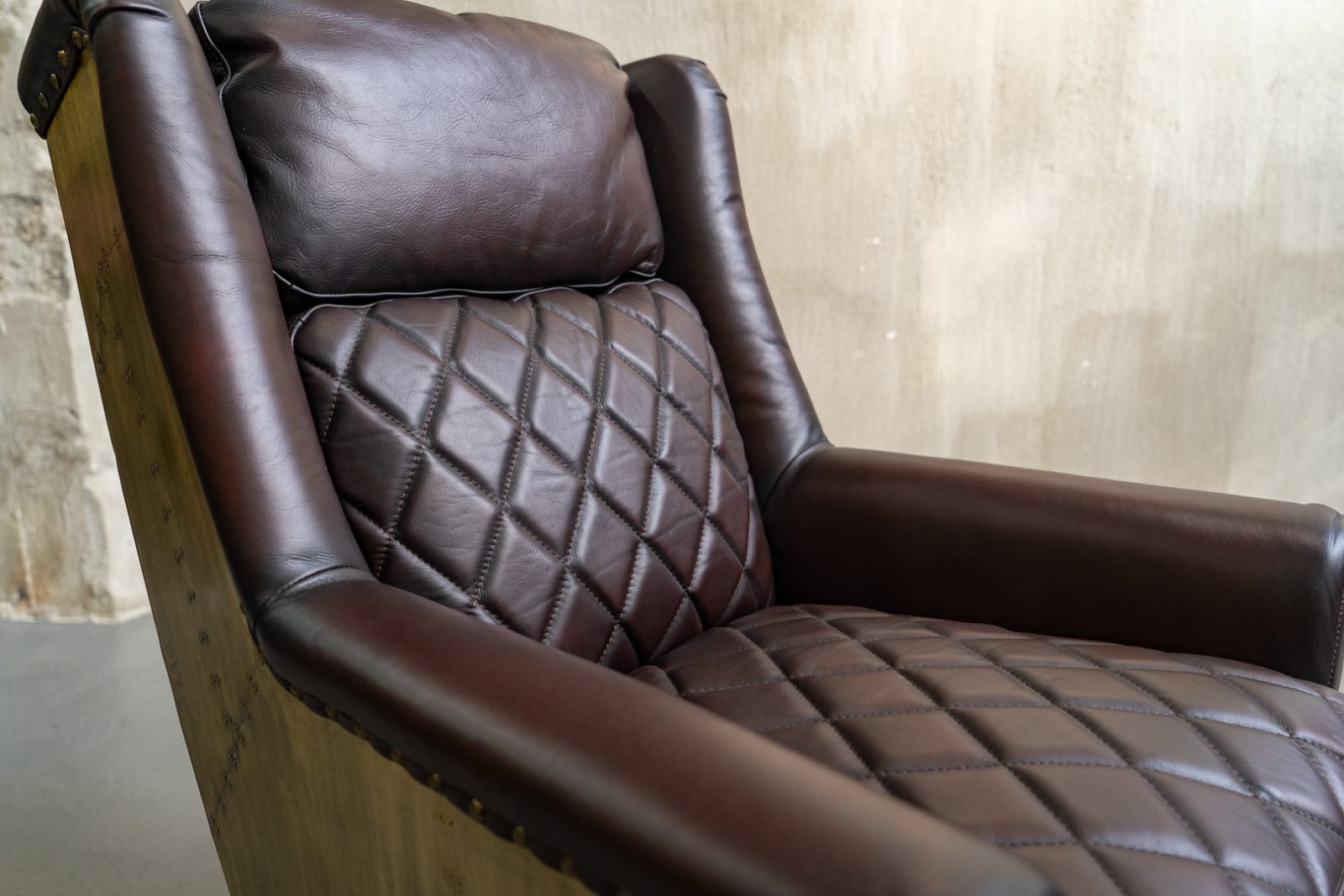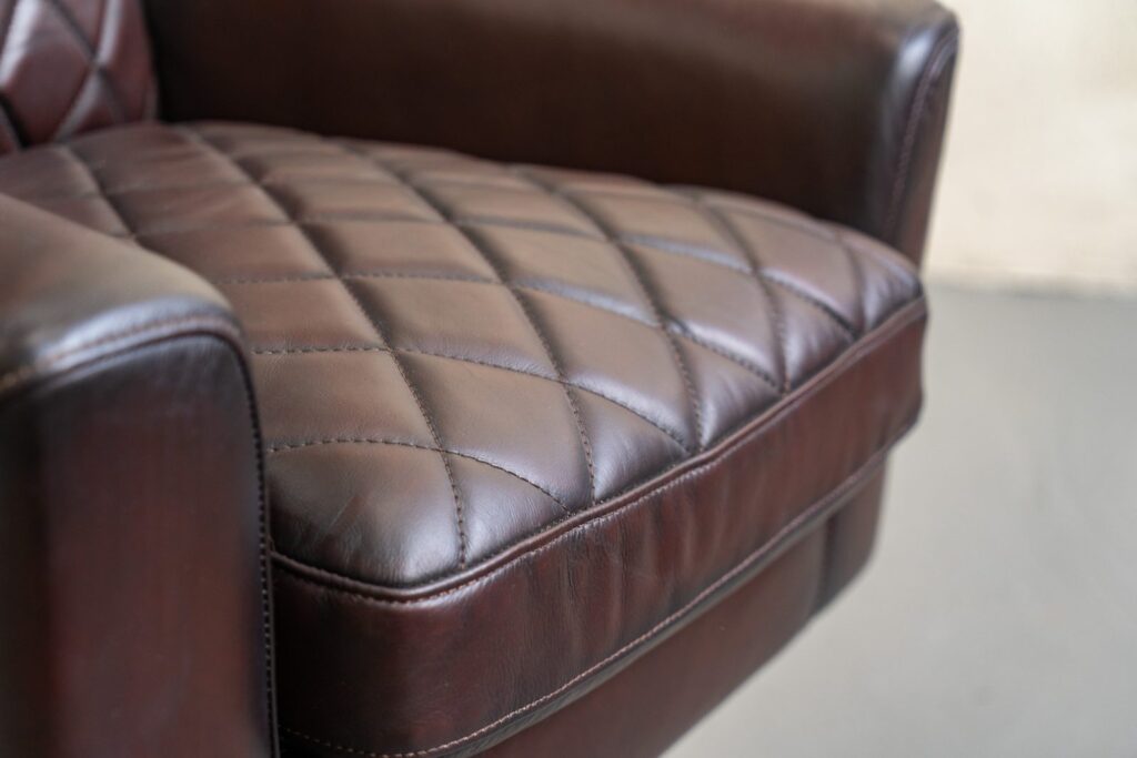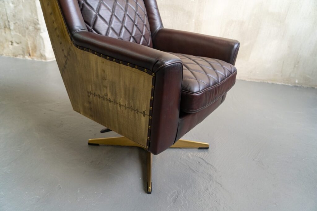 — Премиальные материалы: Корпус кресла выполнен из прочного металлического каркаса с нержавеющей стальной ножкой и латунной отделкой, что не только обеспечивает надежность, но и придает изделию современный вид. Обивка из коровьей кожи top grain добавляет роскоши и делает каждую деталь кресла уникальной.