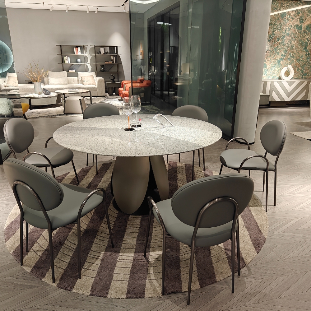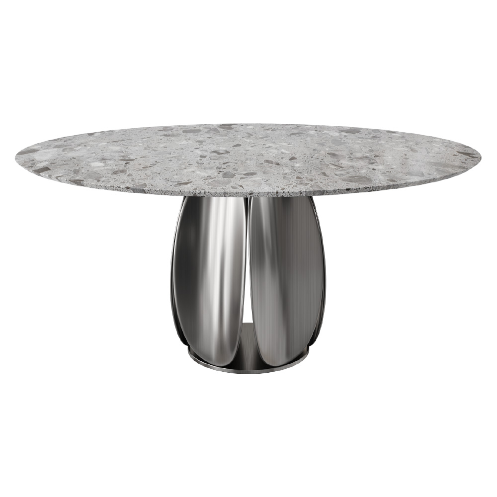 Преобразите ваше пространство с обеденным столом терраццо из коллекции Prestige. Этот уникальный стол, выполненный из высококачественного искусственного камня и нержавеющей стали, станет не только функциональным элементом вашей обстановки, но и стильным акцентом в интерьере.