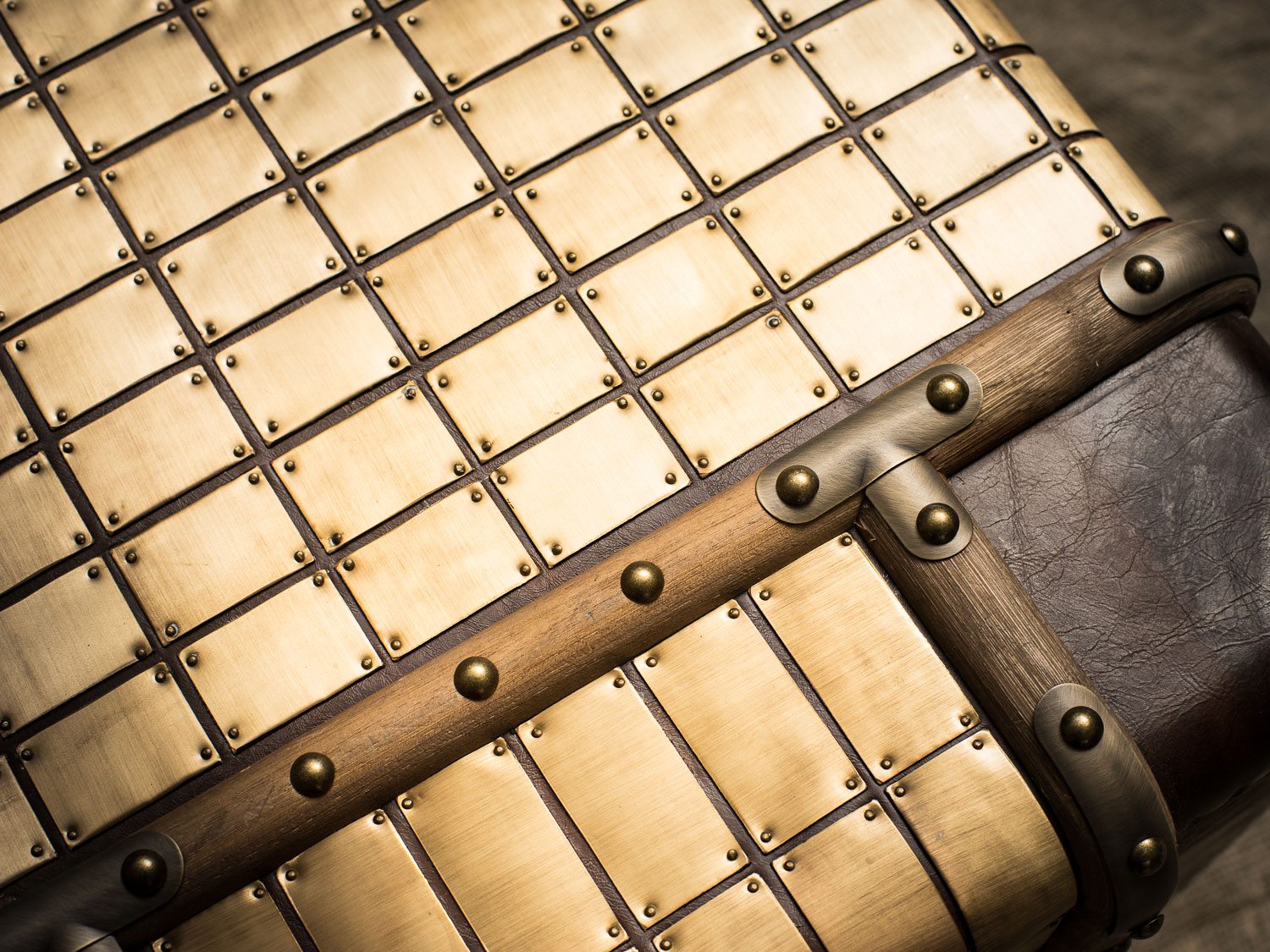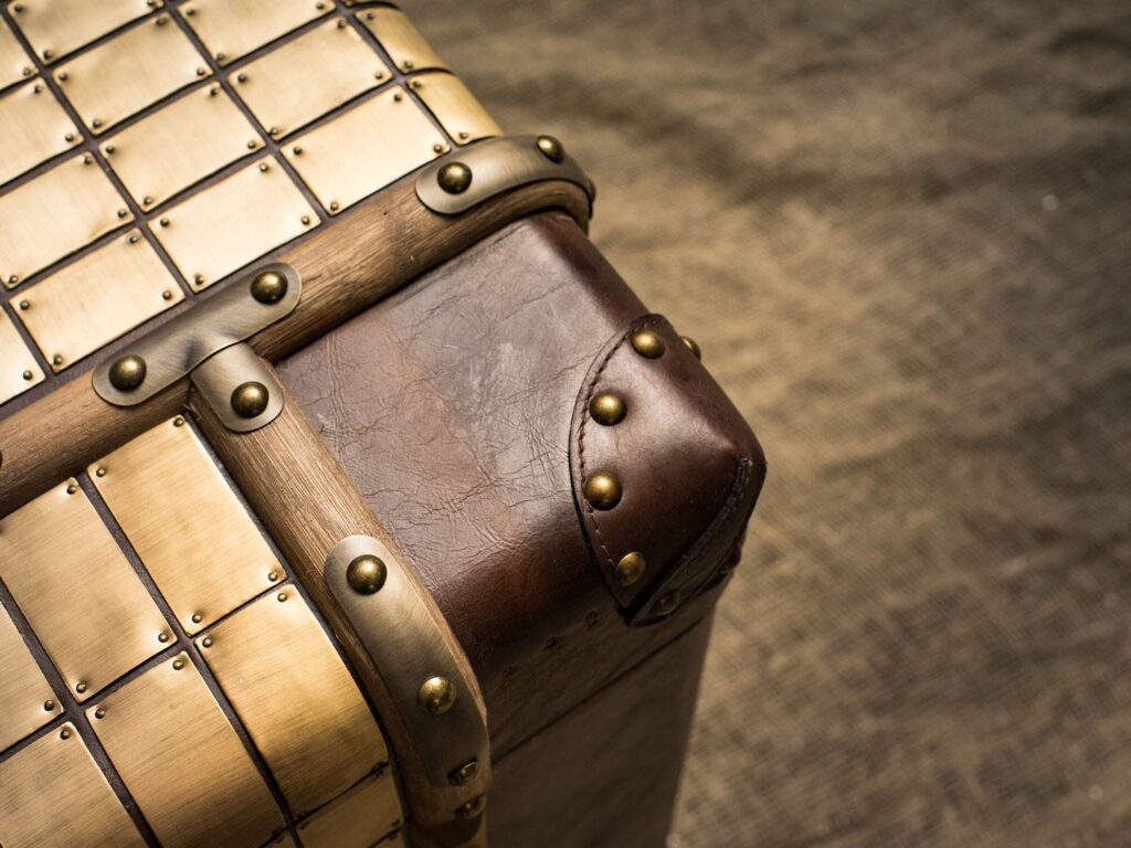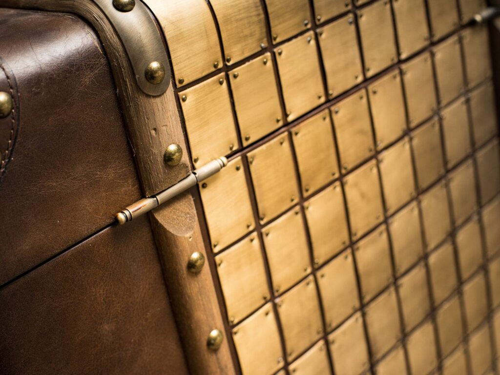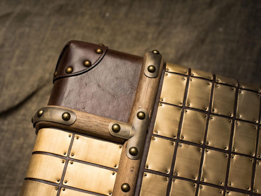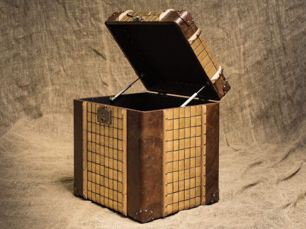 — Материалы: Прочный деревянный каркас, обитый высококачественной кожей, придаёт этому изделию неповторимый вид и долговечность. Латунная отделка и планки из цельного дерева добавляют штрихи элегантности и оригинальности, делая сундук настоящим произведением искусства.