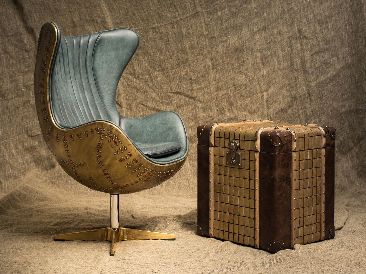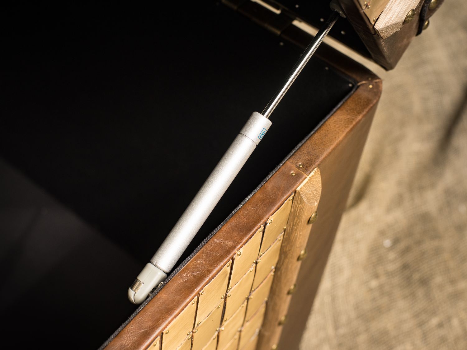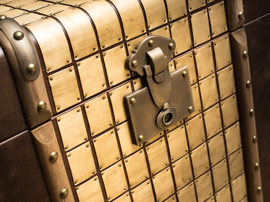 — Материалы: Прочный деревянный каркас, обитый высококачественной кожей, придаёт этому изделию неповторимый вид и долговечность. Латунная отделка и планки из цельного дерева добавляют штрихи элегантности и оригинальности, делая сундук настоящим произведением искусства.