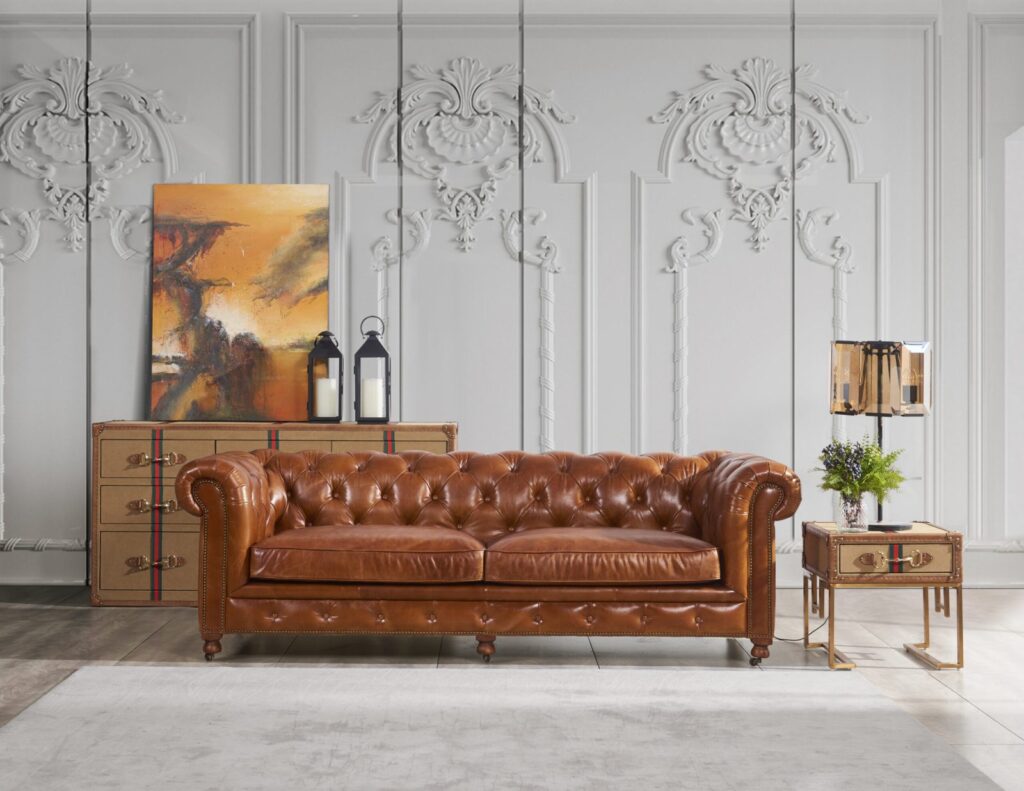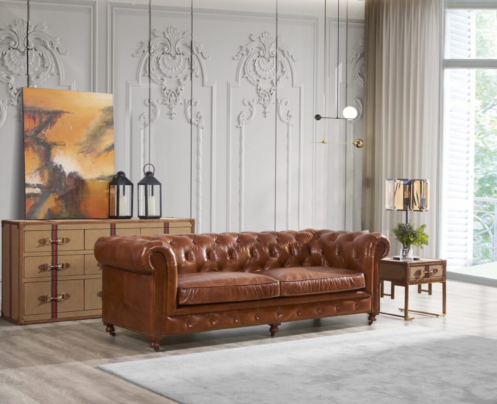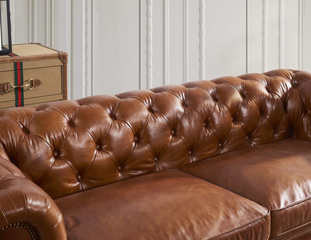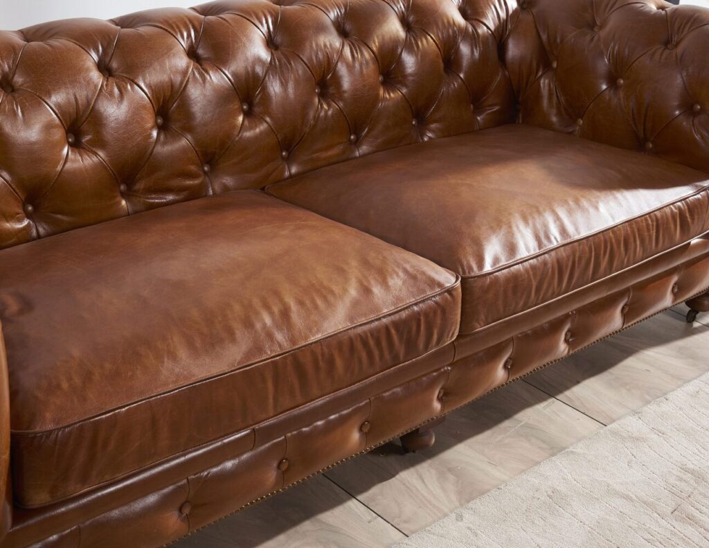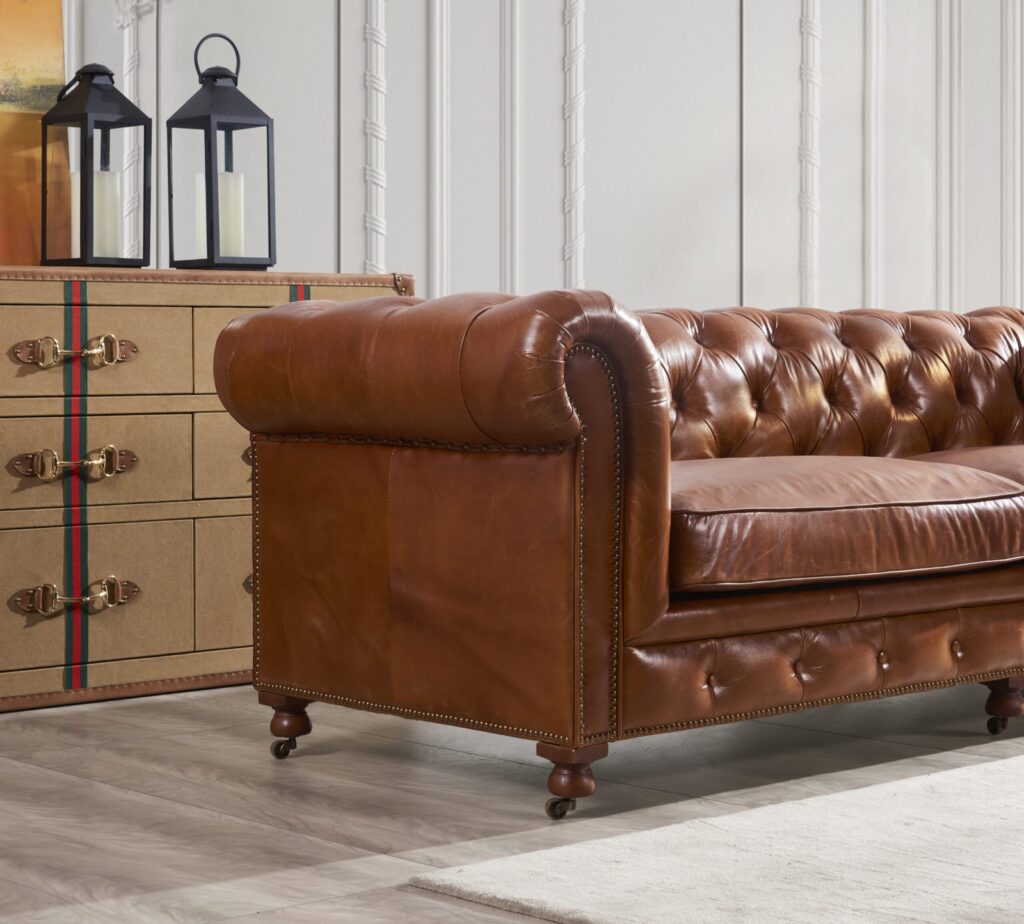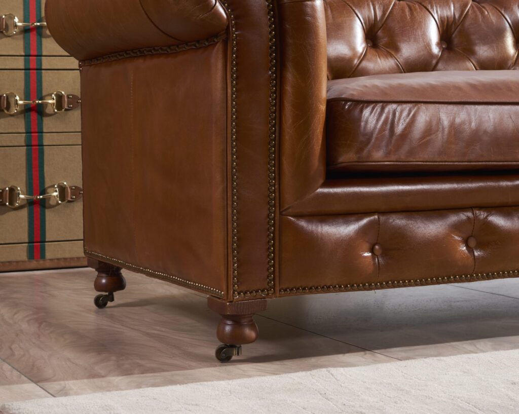 Вдохновленный атмосферой современного лофта, этот диван станет настоящим украшением вашей гостиной. Его прочный каркас из лиственницы и массивные деревянные ножки гарантируют долговечность и надежность, а элегантная обивка из коровьей кожи top grain придаст интерьеру особый шарм и роскошь. Каждая деталь продумана до мелочей: изысканные латунные гвоздики подчеркивают стильный дизайн и придают модели уникальность.