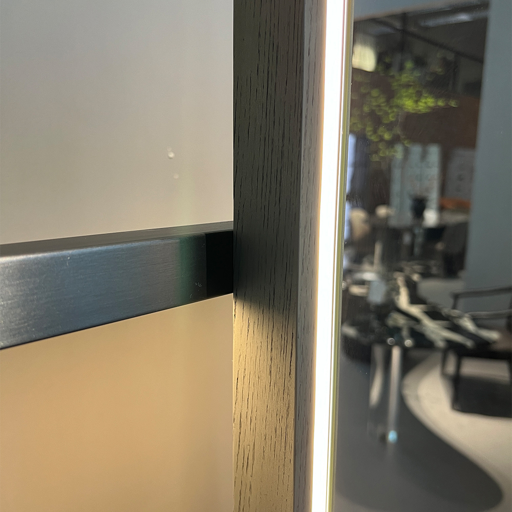 — Эстетика и качество: Ясеневый шпон придает зеркалу теплый, природный вид, а нержавеющая сталь добавляет современный акцент, обеспечивая долговечность и устойчивость к повреждениям.