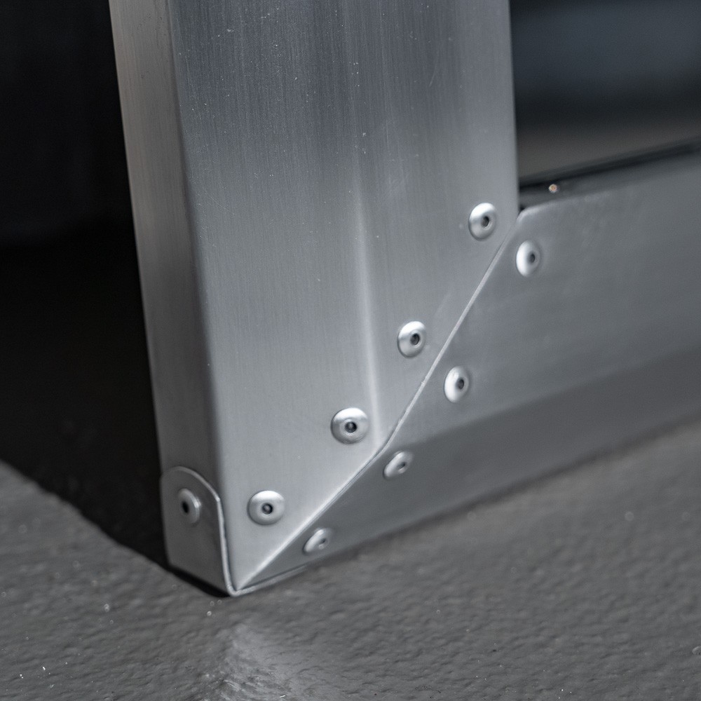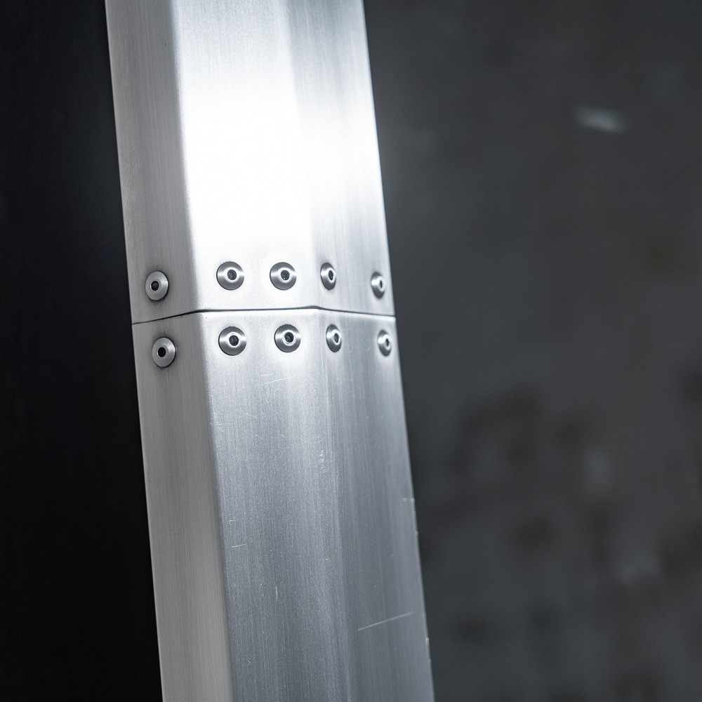 Простая прямоугольная конструкция из алюминия с типичными клепками по периметру придает изделию яркий стилистический акцент, харизму и узнаваемость.